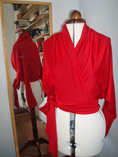 and one week later made it again in red.  I made the red top bigger across the back by about 2 or 3 inches and it has a nicer drape, and can even be worn backwards. This has also worked up well in upcycling old teeshirt fabric snood/scarfs, but as this fabric can be so thin, not worth finishing edges!  (we upcycled a primark snood here and it worked well).  The fabric I used for both of the wraps here is a 2 way stretch heavy jersey and I like the fall of them, and the sleeves have nice full folds when worn.  The upcycled primark snood was a four way stretch and did drape well as it was so light.