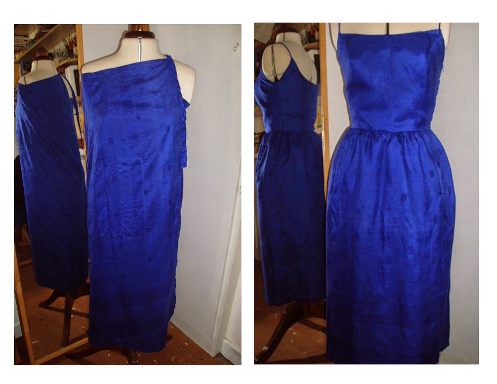 The bodice takes up a little bit more fabric than you would think (or I would think), so getting the right fabric, with right amount from a secondhand piece of clothing was the next hurdle (as in the pile of stuff on the chair beside mannequin). I did have an orange wrap skirt 100% viscose which I did first and then a blue silk wrap skirt as the next one.