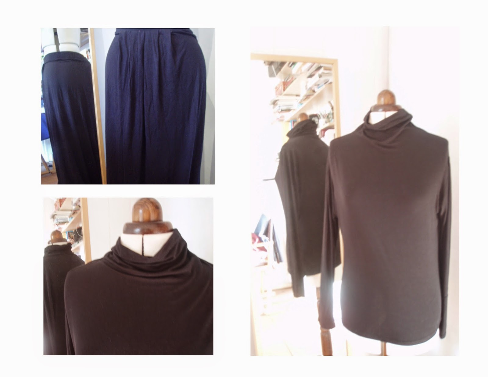 I made a long-sleeve-tee to wear underneath – its a funnel neck. I did a basic pattern draft for it, and used a viscose jersey skirt -the weight and drape of this fabric was divine. Its was very quick, draft, sew, wear and I will be making more of these.