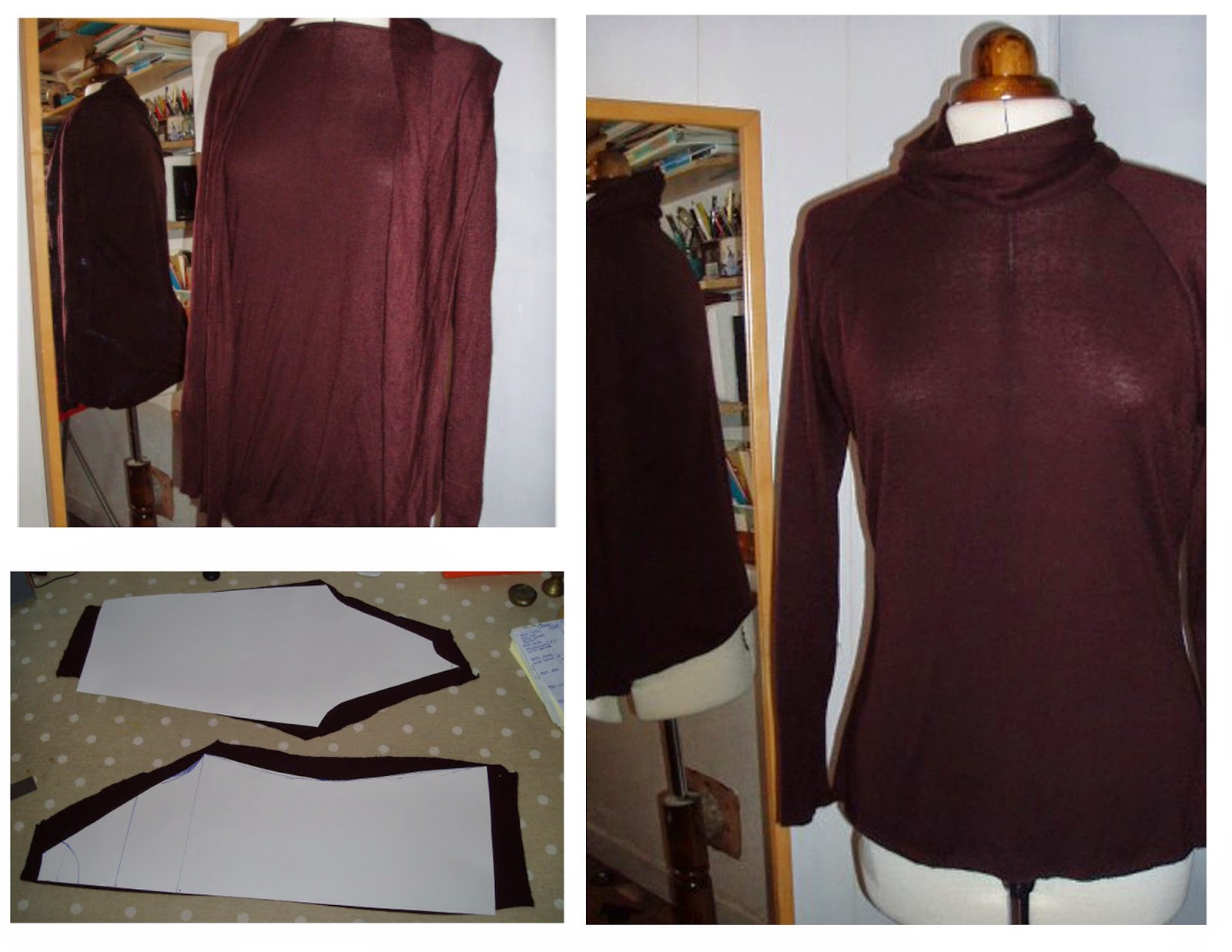 The funnel neck pattern I used in September would have been so perfect – except this brown pullover already had raglan sleeves, and I am finding with these remake projects, its better to work with what you have (sounds so obvious but I often forget the properties of the fabric I am working on – and try to make it fit with the vision in my head). I had to draft a proper jersey block as I have been using very old and badly drafted bits of paper for the last while. I then made a raglan block, and decided it may be best to do a raglan round neck and put a roll collar afterward (I had toyed with the idea of continuing up the seam to make it a funnel neck… )