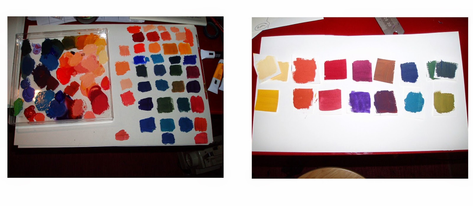 Part of all core studies in art college is colour studies and its pretty generic – different colour wheels and varying versions of the same still life, and generally done with about 3-6 tubes of paint. One of the still-lifes was executed in ‘favourite colours’ and it was definitely the most interesting one for me and now that I am sewing again, I find I am picking up and sewing these colours. I was curious to find the colour project notes (I couldn’t find it all but found bits of colour wheels) so I thought I would mix them again – I remembered them easily enough as I remember the still life I painted in them, and also that they related to a piece of fabric (a scrap I still have that) I had been sewing at the time.
