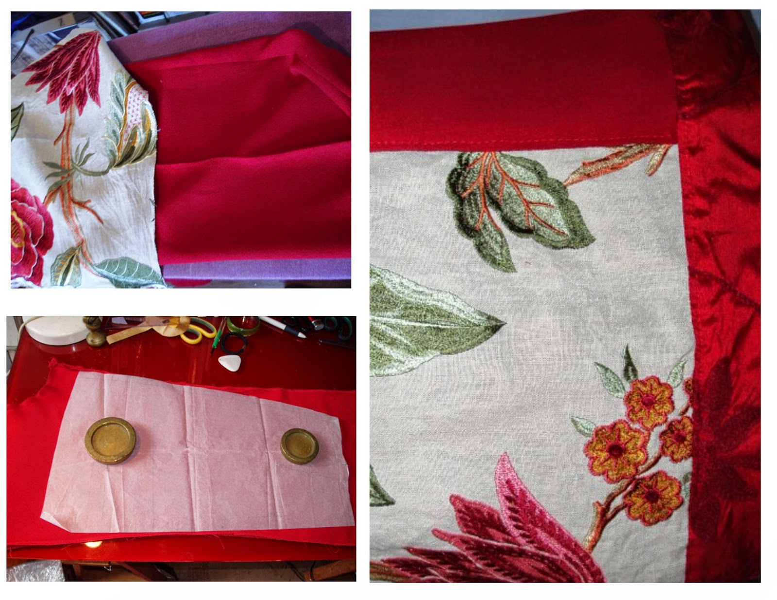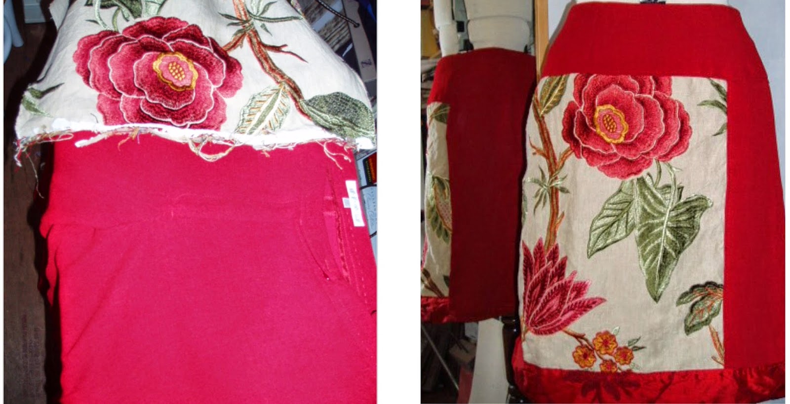 I sewed the front panels together before cutting the front as I wanted the front darts to be in the crepe, not the linen piece. The front darts panel was cut from trouser end piece, and cut on the ‘cross grain’. I thought the crepe and linen mix was a bit flat, so I had a scrap of embroidered raw silk I put at the end. I had toyed with including it on the back skirt but didn’t, I pinned some across, and it seemed to be the same difference whether I did or not, so I used it to face the hem on the back of the skirt instead. I put the skirt together to make sure it hung correctly, and then I top stitched, added zip, hemmed, and then made the facing and lining attached. The lining is from another skirt. Whenever I take pieces apart, the linings are put into a bag and I can take them as I need them, and the left over reds….. they will make a handy addition to the planned patchwork!