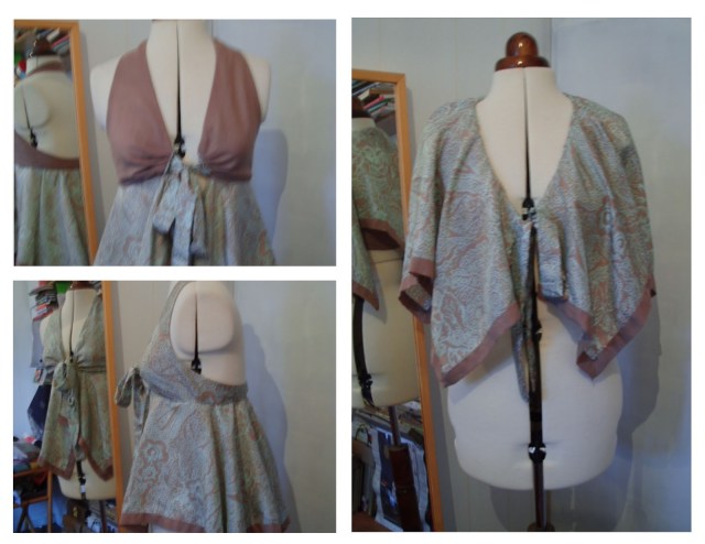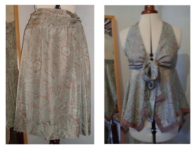 I used up all of the fabric from the skirt, and used the lining to bind the handkerchief edges and line the ‘bra’ part. I did a fair amount of hand sewing in the finish as it was a very very very thin silk.