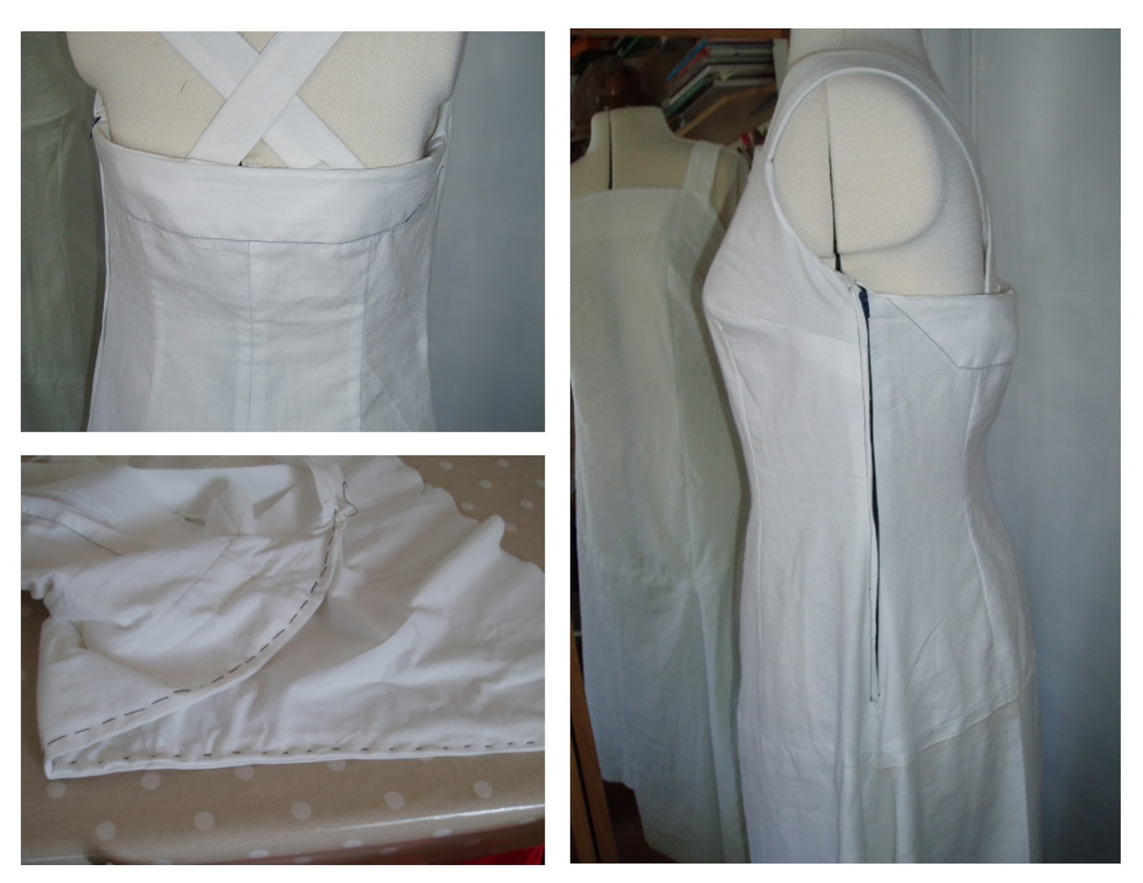 When I decided to remake the chevron halter from the last post, and a totally different dress started to evolve. It was a straight across halter instead of a v, a cross-back-straps instead of neck tie, and an asymmetric front. I drafted a pattern and used one of the front darts as a seam, I don’t know if I should have distributed the darts differently but the pattern I drafted fits. (I am not fully happy with the dart locations). the skirt is a drop waist, and a-line at the back and the front drop is flared out. The original back of the dress was too low, so I added a panel. I think the drop waist may be an inch lower than it should be, but I will think about that again.