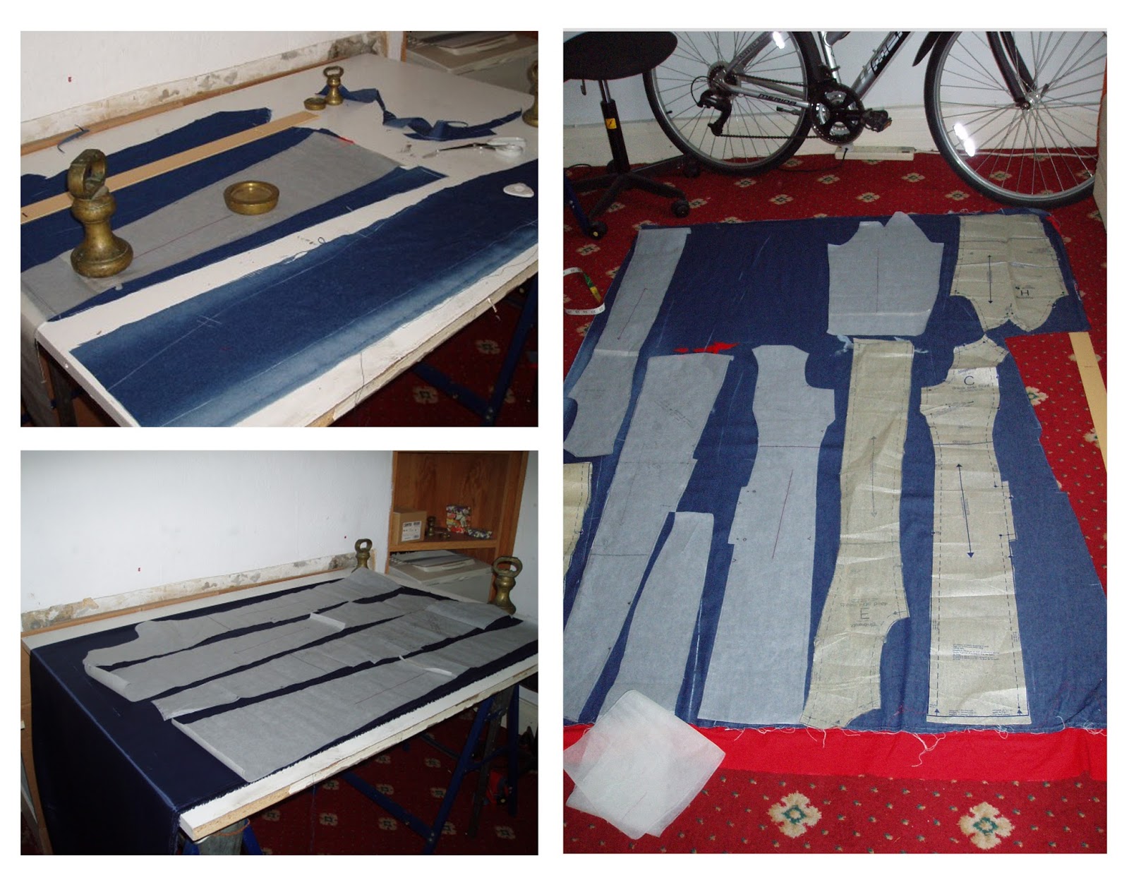 I took apart a purple wool suit but when I fitted the pattern pieces there was too much waste to justify the sew, and potentially I would not get the length. I did have a faded fishy denim chambray curtain (only one) so removed the glued fishes, laundered it, and laid it out. The pattern nearly fitted, and I only figured this out after cutting one piece – so I went for a walk and think (and picked up an end piece of tweed in the charity shop for a euro on same walk), and decided to made the centre back panels with a seam at the waist line, and it was a tight squeeze but it all fitted. I had to pull out the original pattern as well as my tracing to try different layouts, before rough marking and transferring to the table to cut.