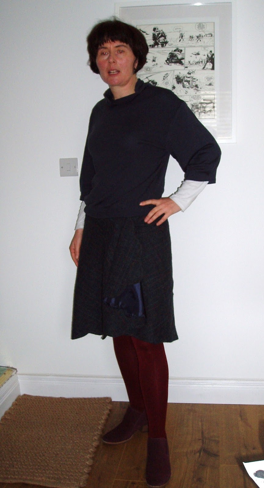 So clever you are – I love it – a real classic staple and for the life of me I can't work out quite how you've managed to transform one into the other! Grey is a great colour and it looks perfect with the skirt. Home made from top to toe – how satisfying must that feel :) That's my aspiration – to get to the stage where most days I am wearing my own makes. I had a clear out of my wardrobe this weekend as I need to be ruthless to accommodate my new hobby – there really is no joy in buying clothes any more – especially if when you wear them people ask if you made it! Looks lovely with the grape tights and boots too.