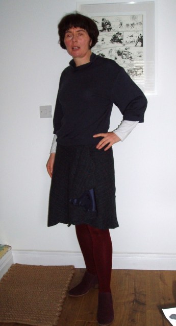 The sweater has a nice shape, its got a dropped shoulder, and some shaping at the waist – I kept the ribbed band in the cut for hem and its perfect.  I am glad I put the one large pleat in the sleeve as it gives a bit of ‘interest’ and the pleats in the original are a bit puffy.  The sweater is a quick sew, and works well with jeans and looks fine with skirt, and I am sure will work with the grey wool trousers if I get to remake them soon (or at least this year), and wears with the poncho too!.  photo below is a bit dull – but only one taken so far.