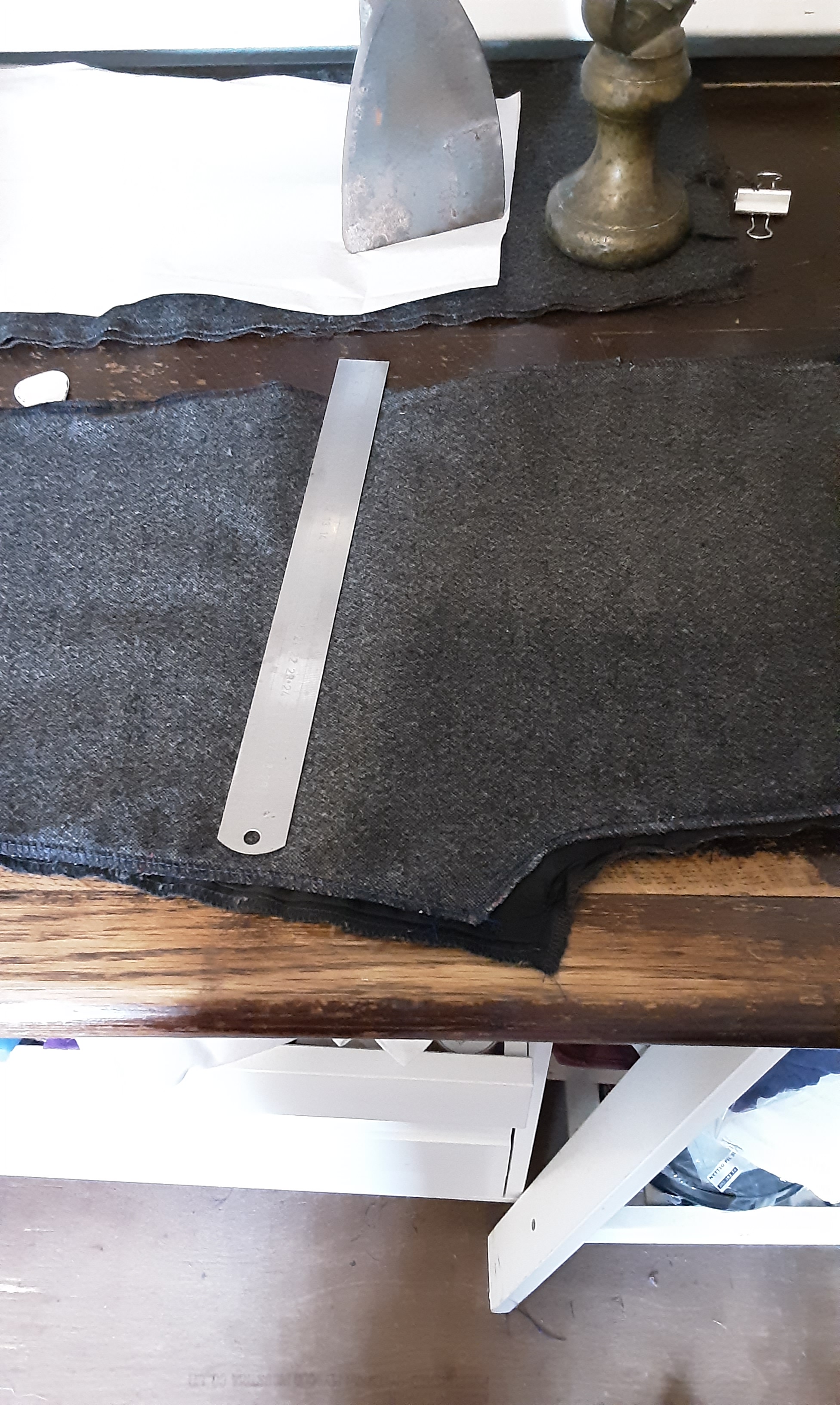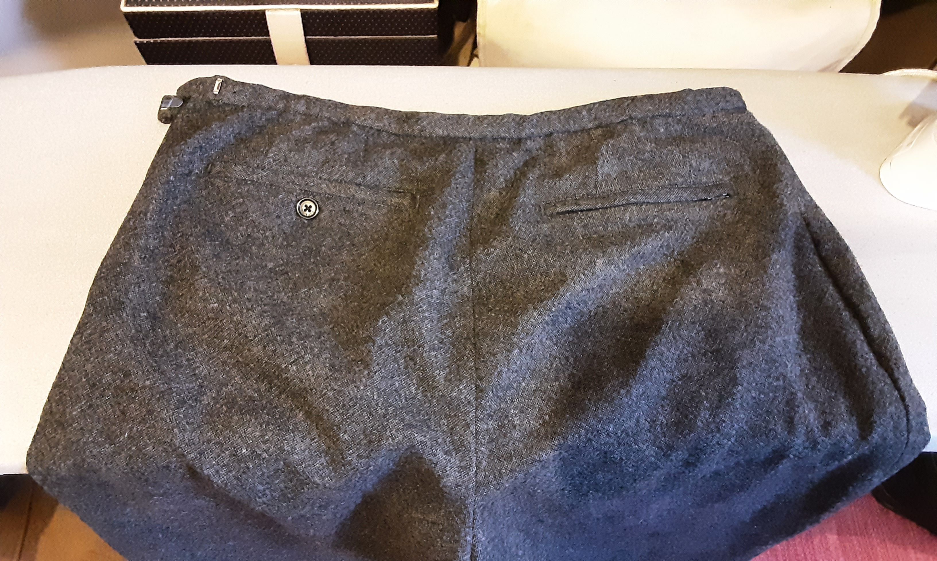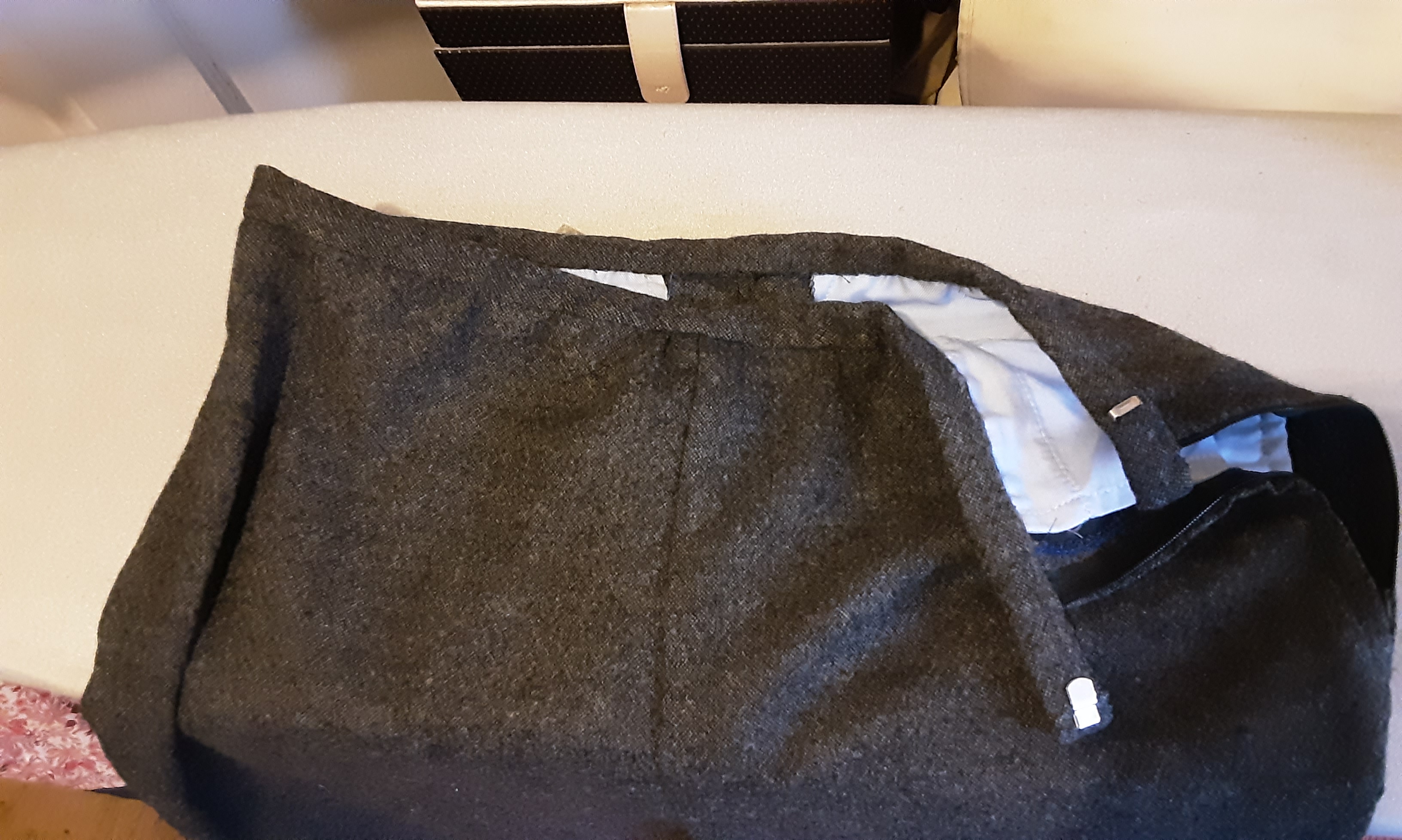I was unsure what to do for the waist, but decided to keep with the original pattern and have a waistband. I rarely use waistband, preferring a faced waist but as I could not introduce additional darts at the back, due to the back pockets already being in place. I ended up easing the trousers into the waistband and then using the steam iron to flatten the ease into place, and shrink in the wool – below photos are before steaming…… wool is the most agreeable fabric to work with!