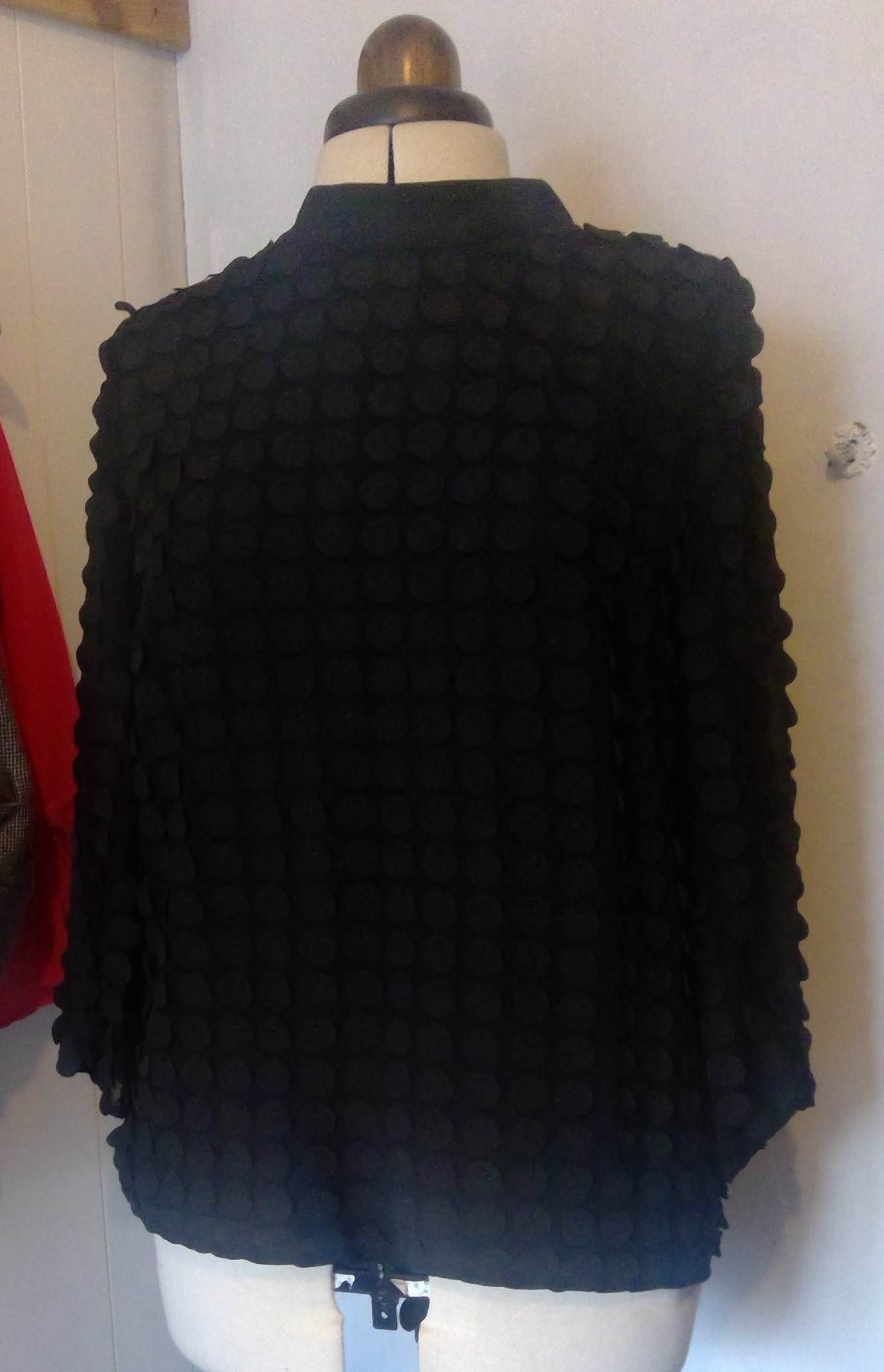 so it all sewed up fairly quickly. I was even happier when I picked up a perfect blouse in the charity shop a week before christmas, so all set. Its a nice simple cut – and interesting fabric of black chiffon like discs sewn on to similar fabric. Its probably to be worn with less underneath as only the front has a layer of lining, but works very well with a black base layer (and sensible warm) as well as the super new-used boots.