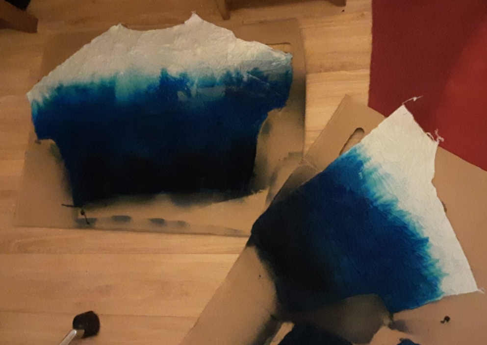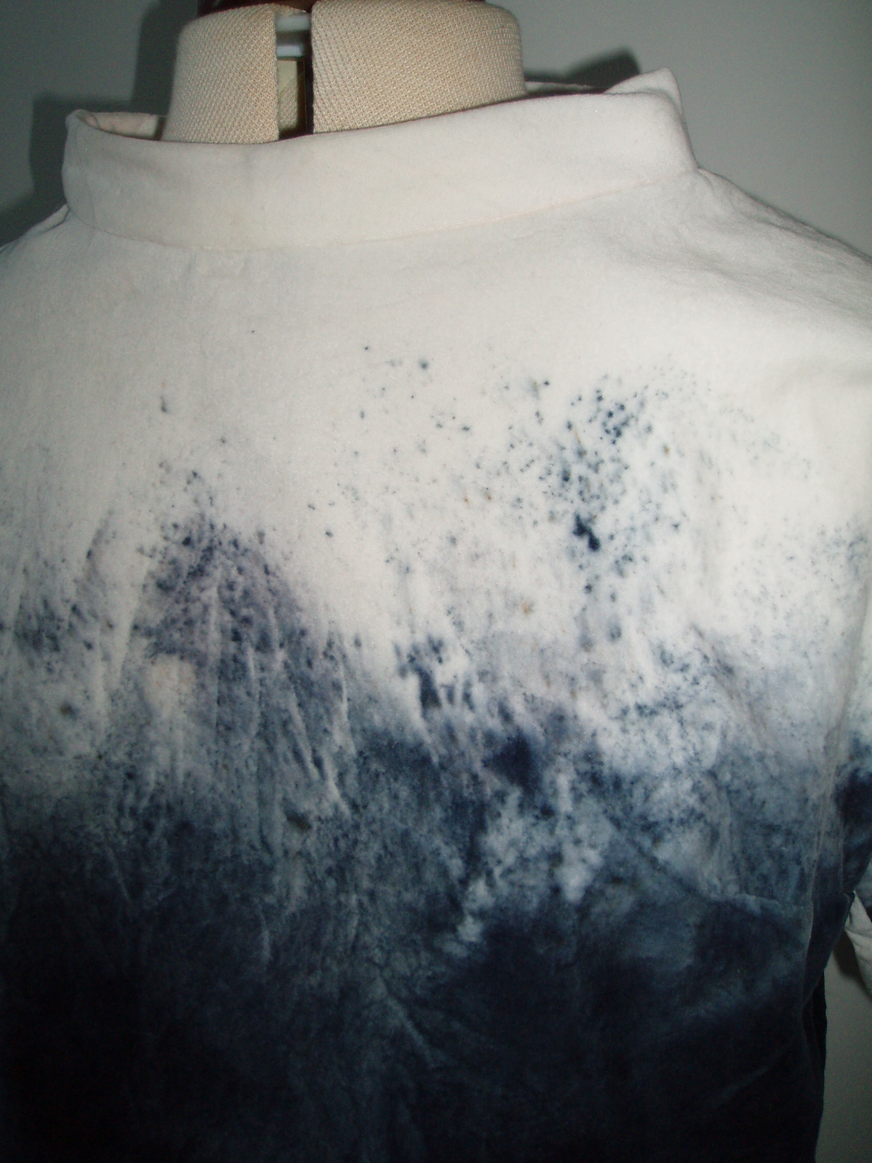 I hit on the idea of spray dye, and an ombre effect. I also got carried away and ended up squeezing 2 tops out of the metre. I first tried fabric paint. I cut tee shirt shapes, dampened fabric, and sprayed some aqua paints on in blues…. then I also tried some black hand dye. I measured out some from the pack and added corresponding amount of salt and put in a spray bottle. The spray dye gave a lovely dusky effect and also seems to be an economical way to use dye, so I may use this technique again.