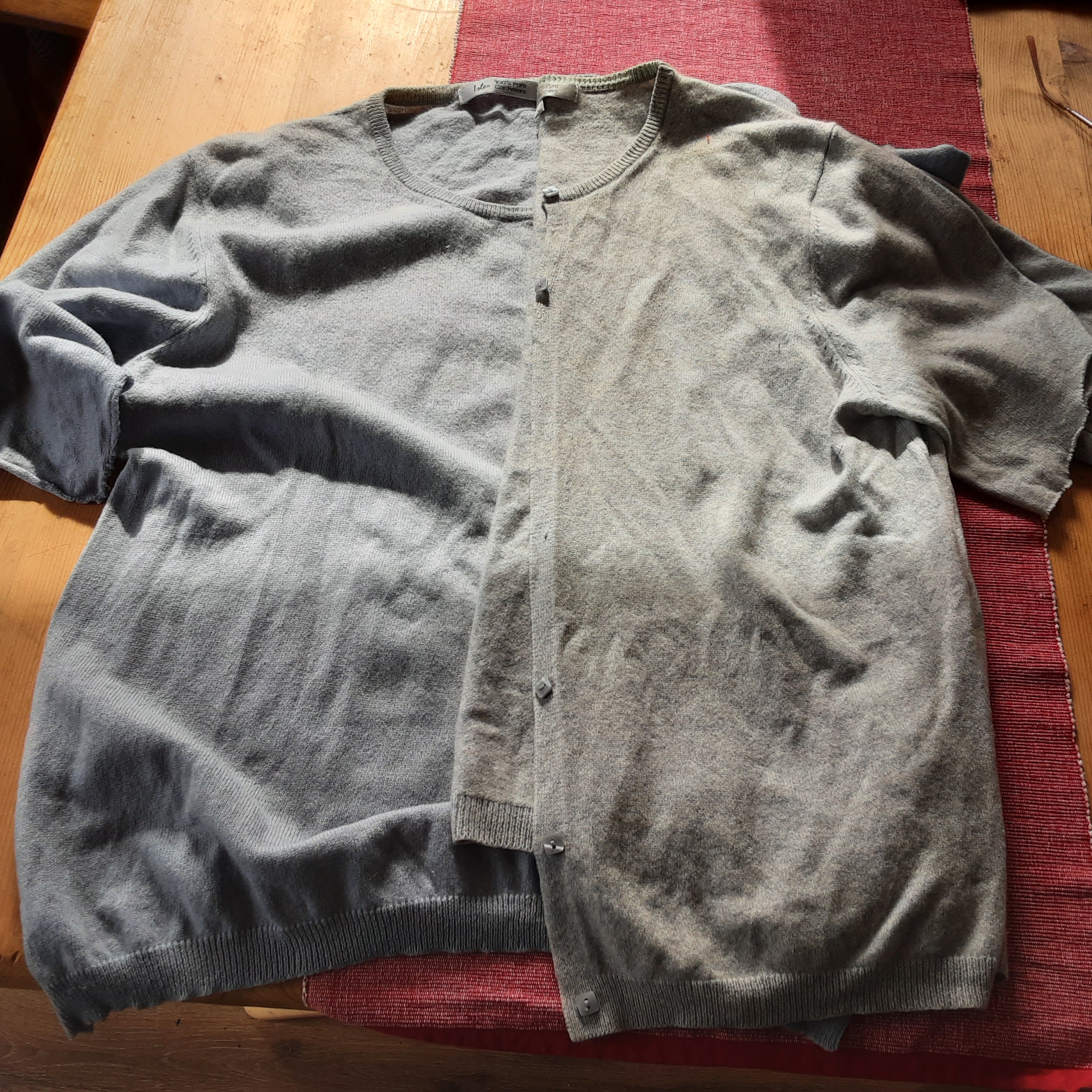 Second dye was some cashmere. I normally avoid dying wool as I have had limited success with it in the past. I did find 2 cashmere sweaters in the textile waste bag some time ago (in the community sew room) so I decided to dye them. Both had their sleeves cut, one was pale blue sweater cut up at sides, and the other a pale grey cardigan. both also had some staining, so I thought I would take a chance a dye them. I laundered and rinsed in a vinegar mix, then put some grey dye in the dyebath, and added some black (as wool can dye a paler shade), and then stirred the sweaters in the dye bath for 40 minutes while listening to a podcast….. wool is so tricky to dye, but I had been given the tip of constant stirring.