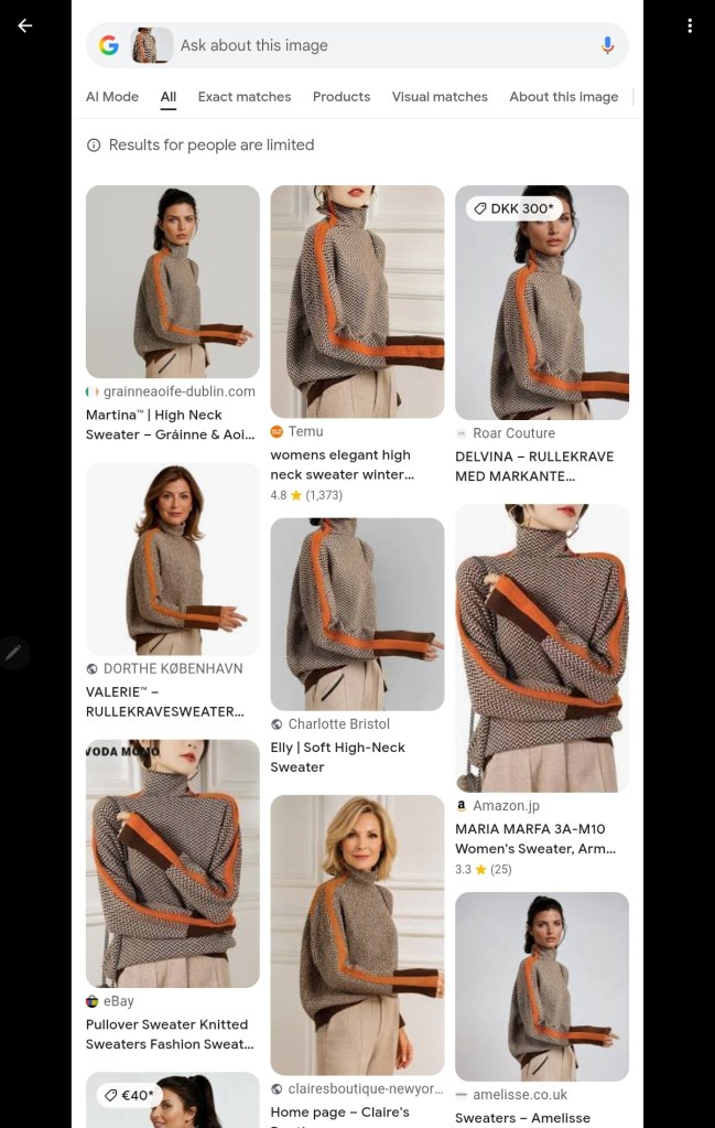 The Facebook comments were interesting, a few pointed how this is all an ‘AI Scam’ and ‘fake’ and also some comments from people who ordered the sweater and were shocked it came from China, and how the quality was awful. It’s easy to sneer and say how did the buyers not guess, but really, its gotten so easy to click and buy, its complete in seconds. Also, I don’t think many people can assess the quality of a garment as they have been surrounded by fast fashion so long, and if you are buying online you don’t even get to feel the cloth……