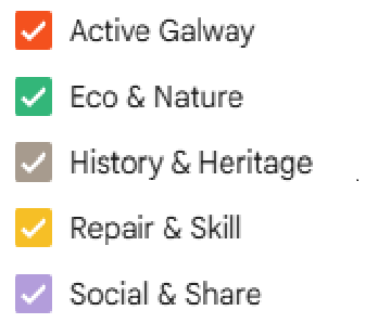 This is a small, hand-picked calendar of Galway community events and stitch groups. I put these together here as I found it wasn’t always easy to find some community events as they were on so many different platforms, and some not at all, and some links out of date. The events below are all free. There is a colour code dots at the front of each event which you can filter on (see filter buttons on right hand corner of calendar)