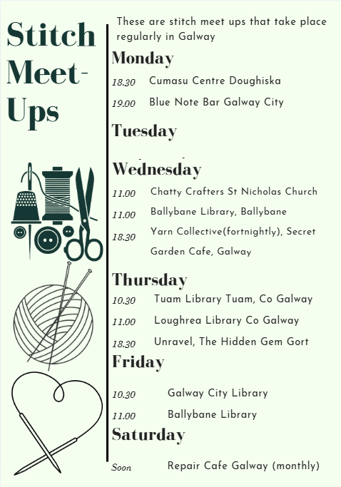 Yarn Collective Galway currently meet in every other Wednesday in the Secret Garden Sea Road, from 18.30 to 20.30…….We knit, crochet, and embroider and chat……these are not classes but we all are very happy to skill share. To check current meet up please go to the facebook page, these meet ups are casual and all are welcome – once a meeting is posted on facebook, just drop by